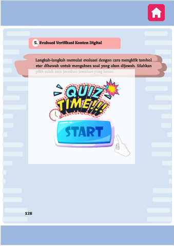 5. Evaluasi Verifikasi Konten Digital Langkah-langkah memulai evaluasi dengan cara mengklik tombol star dibawah untuk mengakses soal yang akan dijawab. Silahkan pilih salah satu jawaban jawaban yang benar. 128