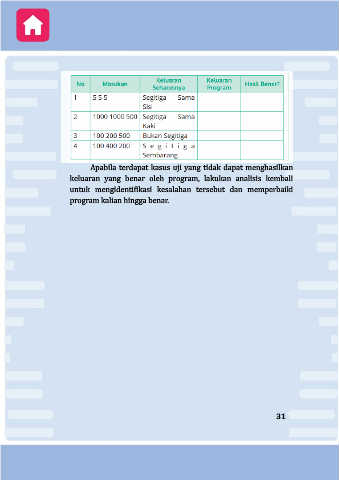 Apabila terdapat kasus uji yang tidak dapat menghasilkan keluaran yang benar oleh program, lakukan analisis kembali untuk mengidentifikasi kesalahan tersebut dan memperbaiki program kalian hingga benar. 31