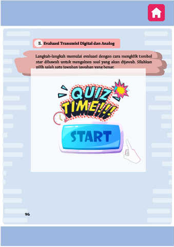 5. Evaluasi Transmisi Digital dan Analog Langkah-langkah memulai evaluasi dengan cara mengklik tombol star dibawah untuk mengakses soal yang akan dijawab. Silahkan pilih salah satu jawaban jawaban yang benar. 96