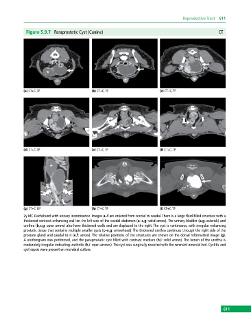 urethra (b,c,g: open arrow) also have thickened walls and are displaced to the right. The cyst is continuous, with irregular enhancing