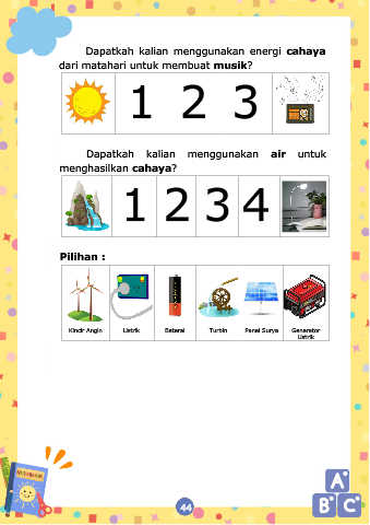 Dapatkah kalian menggunakan energi cahaya dari matahari untuk membuat musik? 1 2 3 Dapatkah kalian menggunakan air untuk menghasilkan cahaya? 1 2 3 4 Pilihan : Kincir Angin Listrik Baterai Turbin Panel Surya Generator Listrik 44