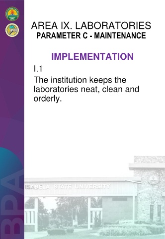 AREA IX. LABORATORIES PARAMETER C - MAINTENANCE IMPLEMENTATION I.1 The institution keeps the laboratories neat, clean and orderly.