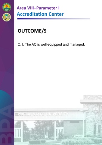 Area VIII–Parameter I Accreditation Center OUTCOME/S O.1. The AC is well-equipped and managed.