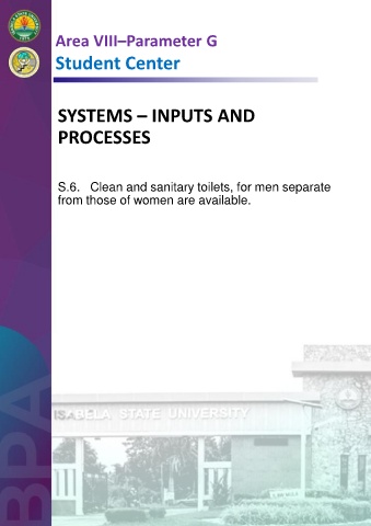 Area VIII–Parameter G Student Center SYSTEMS – INPUTS AND PROCESSES S.6. Clean and sanitary toilets, for men separate from those of women are available.