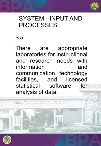 SYSTEM - INPUT AND PROCESSES S.5 There are appropriate laboratories for instructional and research needs with information and communication technology facilities, and licensed statistical software for analysis of data.