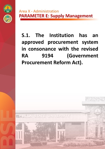 Area X - Administration PARAMETER E: Supply Management S.1. The Institution has an approved procurement system in consonance with the revised RA 9194 (Government Procurement Reform Act).