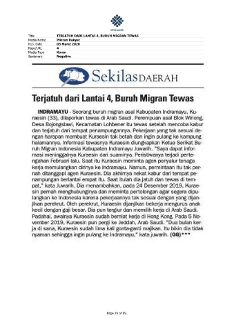 Title TERJATUH DARI LANTAI 4, BURUH MIGRAN TEWAS Media Name Pikiran Rakyat Pub. Date 03 Maret 2020 Page/URL 4 Media Type Koran Sentiment Negative Page 19 of 99.