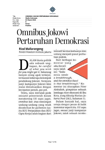 Title OMNIBUS JOKOWI PERTARUHAN DEMOKRASI Media Name Media Indonesia Pub. Date 03 Maret 2020 Page/URL 6 Media Type Koran Sentiment Positive Page 7 of 99.