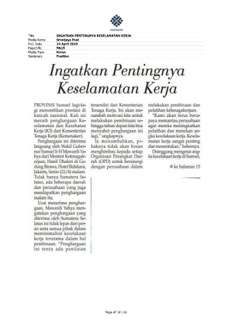 Title INGATKAN PENTINGNYA KESELAMATAN KERJA Media Name Sriwijaya Post Pub. Date 24 April 2019 Page/URL 9&15 Media Type Koran Sentiment Positive Page 47 of 119.