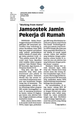 Title JAMSOSTEK JAMIN PEKERJA DI RUMAH Media Name Koran Jakarta Pub. Date 20 Maret 2020 Page/URL 9 Media Type Koran Sentiment Positive Page 103 of 134.