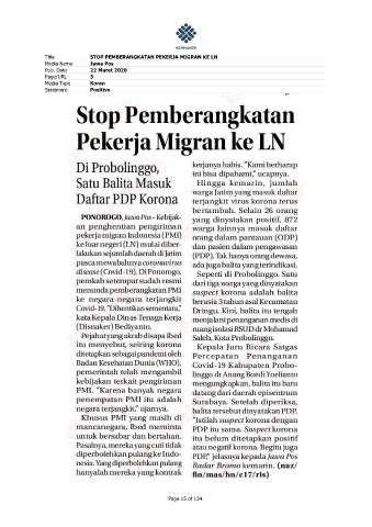 Title STOP PEMBERANGKATAN PEKERJA MIGRAN KE LN Media Name Jawa Pos Pub. Date 22 Maret 2020 Page/URL 3 Media Type Koran Sentiment Positive Page 15 of 134.