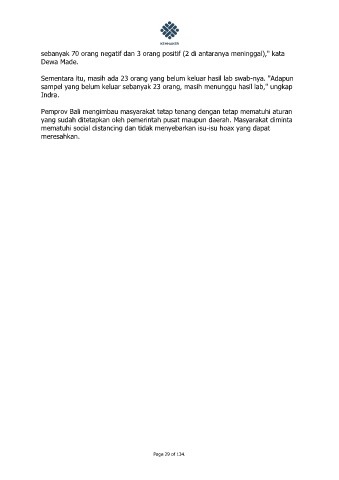 sebanyak 70 orang negatif dan 3 orang positif (2 di antaranya meninggal)," kata