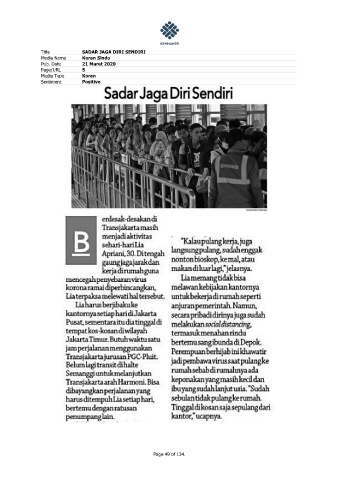 Title SADAR JAGA DIRI SENDIRI Media Name Koran Sindo Pub. Date 21 Maret 2020 Page/URL 5 Media Type Koran Sentiment Positive Page 49 of 134.