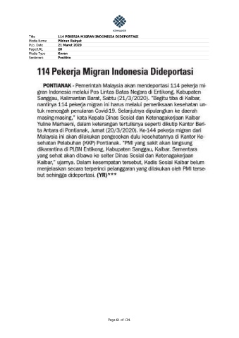 Title 114 PEKERJA MIGRAN INDONESIA DIDEPORTASI Media Name Pikiran Rakyat Pub. Date 21 Maret 2020 Page/URL 20 Media Type Koran Sentiment Positive Page 61 of 134.