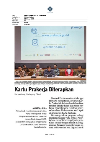 Title KARTU PRAKERJA DITERAPKAN Media Name Pikiran Rakyat Pub. Date 21 Maret 2020 Page/URL 19 Media Type Koran Sentiment Positive Page 62 of 134.