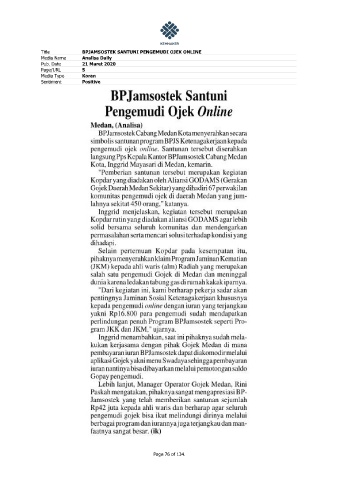 Title BPJAMSOSTEK SANTUNI PENGEMUDI OJEK ONLINE Media Name Analisa Daily Pub. Date 21 Maret 2020 Page/URL 5 Media Type Koran Sentiment Positive Page 76 of 134.