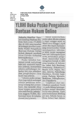 Title YLBHI BUKA POSKO PENGADUAN BANTUAN HUKUM ONLINE Media Name Harian Terbit Pub. Date 21 Maret 2020 Page/URL 5 Media Type Koran Sentiment Positive Page 94 of 134.