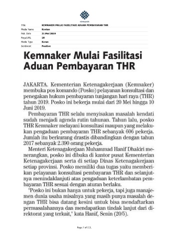 Title KEMNAKER MULAI FASILITASI ADUAN PEMBAYARAN THR Media Name Kontan Pub. Date 21 Mei 2019 Page/URL 18 Media Type Koran Sentiment Positive Page 7 of 111.