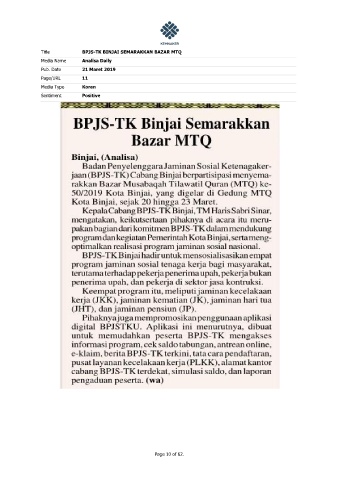 Title BPJS-TK BINJAI SEMARAKKAN BAZAR MTQ Media Name Analisa Daily Pub. Date 21 Maret 2019 Page/URL 11 Media Type Koran Sentiment Positive Page 10 of 62.
