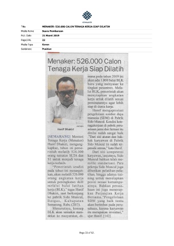 Title MENAKER: 526.000 CALON TENAGA KERJA SIAP DILATIH Media Name Suara Pembaruan Pub. Date 21 Maret 2019 Page/URL 22 Media Type Koran Sentiment Positive Page 33 of 62.