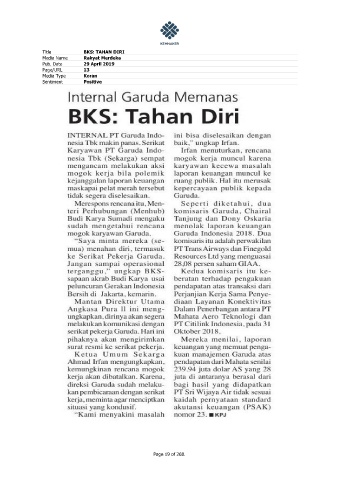 Title BKS: TAHAN DIRI Media Name Rakyat Merdeka Pub. Date 29 April 2019 Page/URL 13 Media Type Koran Sentiment Positive Page 19 of 268.