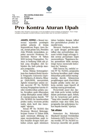 Title PRO-KONTRA ATURAN UPAH Media Name Kompas Pub. Date 29 April 2019 Page/URL 13 Media Type Koran Sentiment Positive Page 25 of 268.