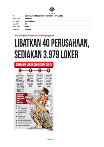 Title LIBATKAN 40 PERUSAHAAN, SEDIAKAN 3.979 LOKER Media Name Jawa Pos Pub. Date 10 April 2019 Page/URL 20 Media Type Koran Sentiment Positive Page 19 of 84.