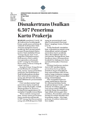 Title DISNAKERTRANS USULKAN 6.507 PENERIMA KARTU PRAKERJA Media Name Riau Post Pub. Date 22 April 2020 Page/URL 12 Media Type Koran Sentiment Positive Page 134 of 273.