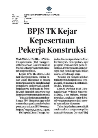 Title BPJS TK KEJAR KEPESERTAAN PEKERJA KONSTRUKSI Media Name Fajar Pub. Date 22 Juni 2019 Page/URL 4 Media Type Koran Sentiment Positive Page 206 of 352.