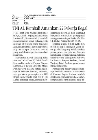 Title TNI AL KEMBALI AMANKAN 22 PEKERJA ILEGAL Media Name Media Indonesia Pub. Date 21 April 2020 Page/URL 4 Media Type Koran Sentiment Positive Page 4 of 248.