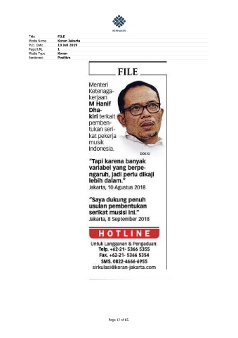 Title FILE Media Name Koran Jakarta Pub. Date 10 Juli 2019 Page/URL 1 Media Type Koran Sentiment Positive Page 12 of 65.