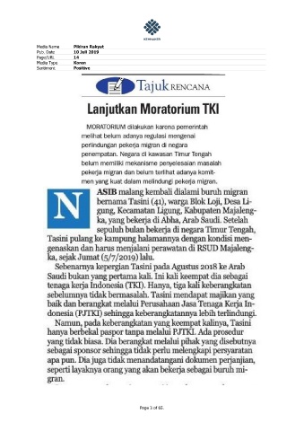 Media Name Pikiran Rakyat Pub. Date 10 Juli 2019 Page/URL 14 Media Type Koran Sentiment Positive Page 3 of 65.