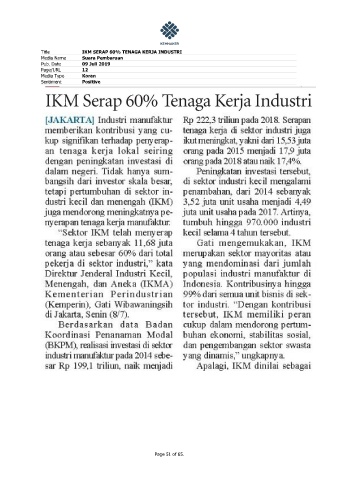 Title IKM SERAP 60% TENAGA KERJA INDUSTRI Media Name Suara Pembaruan Pub. Date 09 Juli 2019 Page/URL 12 Media Type Koran Sentiment Positive Page 51 of 65.