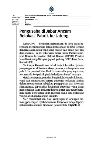 Title PENGUSAHA DI JABAR ANCAM RELOKASI PABRIK KE JATENG Media Name Koran Jakarta Pub. Date 19 November 2019 Page/URL 7 Media Type Koran Sentiment Negative Page 18 of 101.