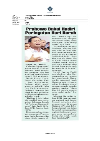 Title PRABOWO BAKAL HADIRI PERINGATAN HARI BURUH Media Name Lampu Hijau Pub. Date 30 April 2019 Page/URL 06 Media Type Koran Sentiment Positive Page 468 of 656.