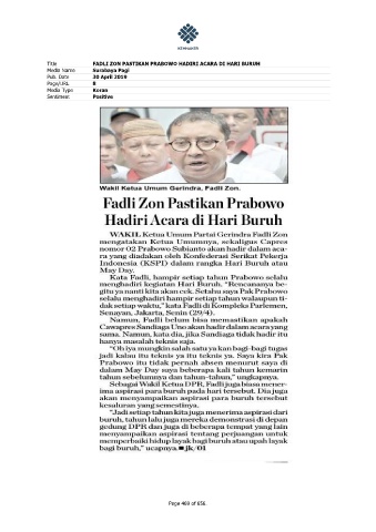 Title FADLI ZON PASTIKAN PRABOWO HADIRI ACARA DI HARI BURUH Media Name Surabaya Pagi Pub. Date 30 April 2019 Page/URL 8 Media Type Koran Sentiment Positive Page 469 of 656.
