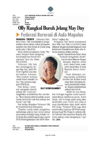 Title OLLY RANGKUL BURUH JELANG MAY DAY Media Name Tribun Manado Pub. Date 30 April 2019 Page/URL 8 Media Type Koran Sentiment Positive Title JELANG HARI BURUH, DISNAKER TEMUI SERIKAT Media Name Satelit News Pub. Date 30 April 2019 Page 472 of 656.