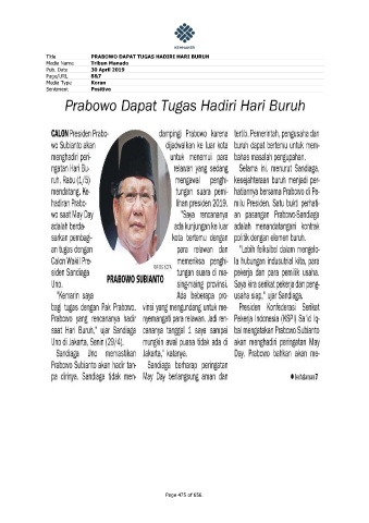 Title PRABOWO DAPAT TUGAS HADIRI HARI BURUH Media Name Tribun Manado Pub. Date 30 April 2019 Page/URL 8&7 Media Type Koran Sentiment Positive Page 475 of 656.