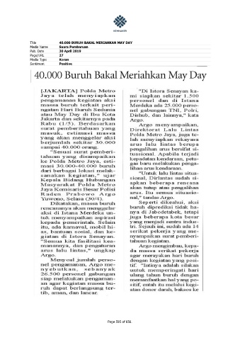Title 40.000 BURUH BAKAL MERIAHKAN MAY DAY Media Name Suara Pembaruan Pub. Date 30 April 2019 Page/URL 27 Media Type Koran Sentiment Positive Page 595 of 656.