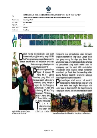 PERTANDINGAN MINI SOCCER ANTARA KARYAWAN HOK TONG GROUP (MAY DAY CUP Title 2019) DALAM RANGKA MEMPERINGATI HARI BURUH INTERNASIONAL Media Name Sriwijaya Post Pub. Date 05 Mei 2019 Page/URL 16 Media Type Koran Sentiment Positive Page 37 of 255.