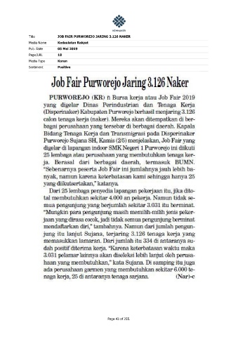 Title JOB FAIR PURWOREJO JARING 3.126 NAKER Media Name Kedaulatan Rakyat Pub. Date 05 Mei 2019 Page/URL 18 Media Type Koran Sentiment Positive Page 43 of 255.