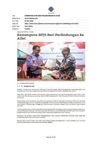 Title KEMENPORA-BPJS BERI PERLINDUNGAN KE ATLET Media Name koran-jakarta.com Pub. Date 04 Mei 2019 Page/URL http://www.koran-jakarta.com/kemenpora-bpjs-beri-perlindungan-ke-atlet / Media Type Pers Online Sentiment Positive Page 54 of 255.