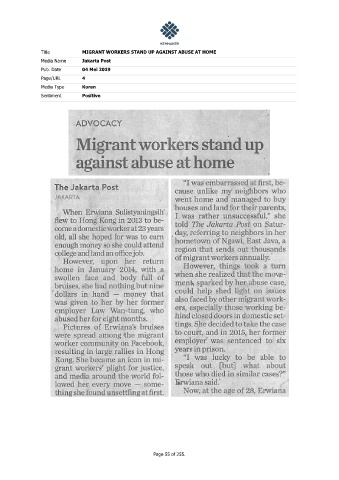 Title MIGRANT WORKERS STAND UP AGAINST ABUSE AT HOME Media Name Jakarta Post Pub. Date 04 Mei 2019 Page/URL 4 Media Type Koran Sentiment Positive Page 55 of 255.