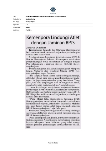 Title KEMENPORA LINDUNGI ATLET DENGAN JAMINAN BPJS Media Name Analisa Daily Pub. Date 04 Mei 2019 Page/URL 13 Media Type Koran Sentiment Positive Page 86 of 255.