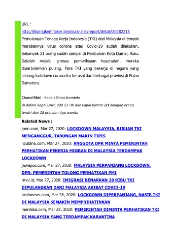 sindonews.com, Mar 28, 2020: LOCKDOWN DIPERPANJANG, NASIB TKI