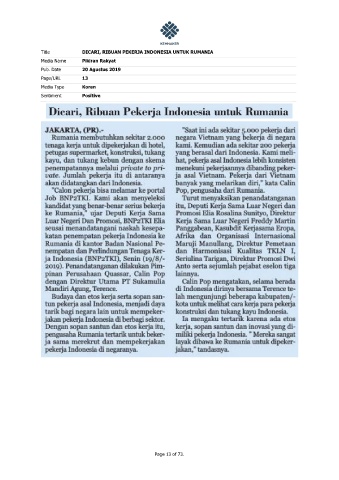 Title DICARI, RIBUAN PEKERJA INDONESIA UNTUK RUMANIA Media Name Pikiran Rakyat Pub. Date 20 Agustus 2019 Page/URL 13 Media Type Koran Sentiment Positive Page 13 of 73.