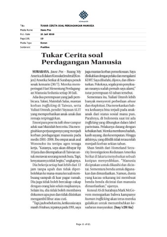 Title TUKAR CERITA SOAL PERDAGANGAN MANUSIA Media Name Jawa Pos Pub. Date 31 Juli 2019 Page/URL 19 Media Type Koran Sentiment Positive Page 11 of 63.