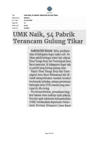 Title UMK NAIK, 54 PABRIK TERANCAM GULUNG TIKAR Media Name Indopos Pub. Date 31 Juli 2019 Page/URL 12 Media Type Koran Sentiment Positive Page 18 of 63.