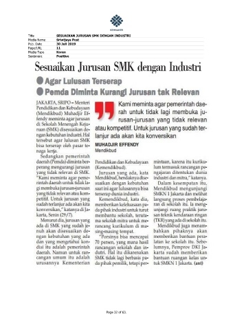 Title SESUAIKAN JURUSAN SMK DENGAN INDUSTRI Media Name Sriwijaya Post Pub. Date 30 Juli 2019 Page/URL 11 Media Type Koran Sentiment Positive Page 32 of 63.