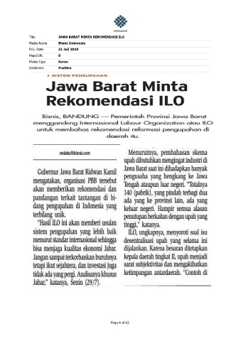 Title JAWA BARAT MINTA REKOMENDASI ILO Media Name Bisnis Indonesia Pub. Date 31 Juli 2019 Page/URL 8 Media Type Koran Sentiment Positive Page 4 of 63.